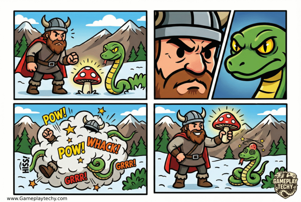 And here’s where it gets unhinged: punching snakes, stealing mushrooms, fighting wolves, taking down boar for fresh meat, gathering materials to craft weapons… and nearly freezing my Viking butt cheeks off in the process.
